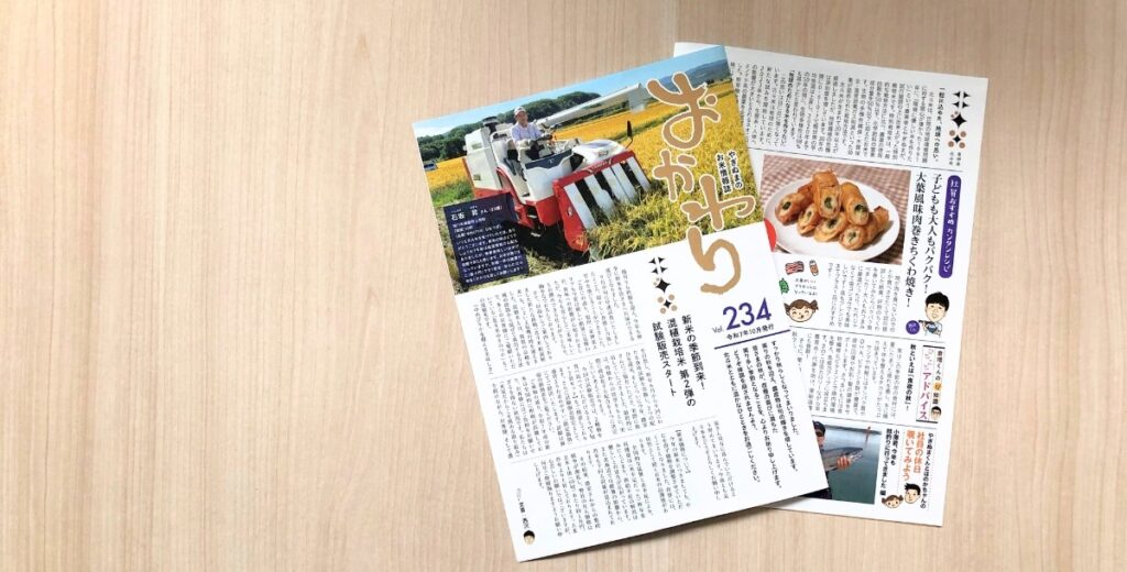 お届け時には、毎月更新している情報誌「おかわり」を配布しています。