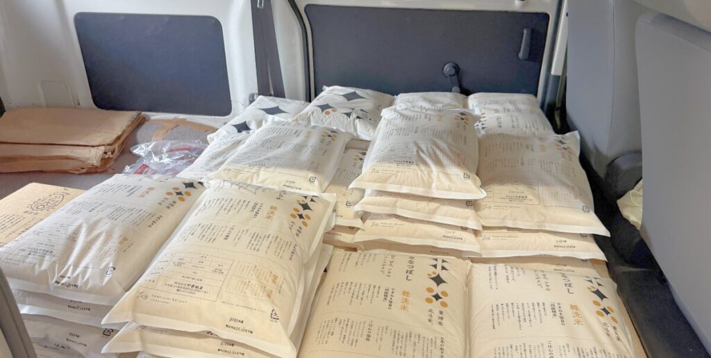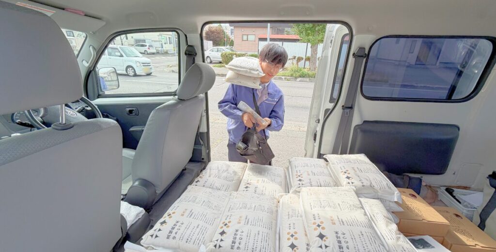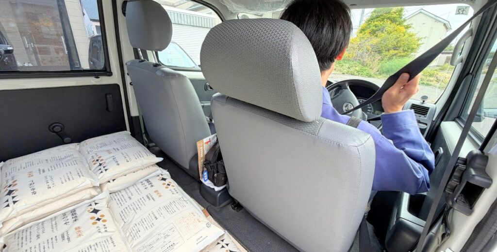 お米が崩れないようキレイに丁寧に車へ積み込みます。