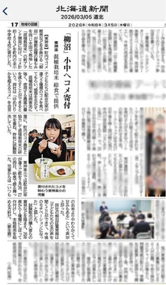 当社では、2026年2月26日・27日の両日、東神楽町内の全小中学校4校に対し、独自の手法で栽培した「新混植栽培米」約150kgを寄付し、学校給食として提供していただきました。
